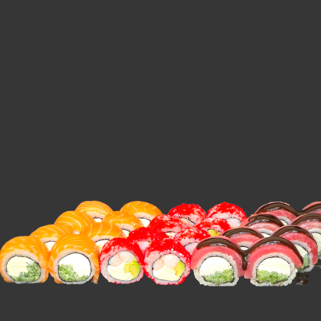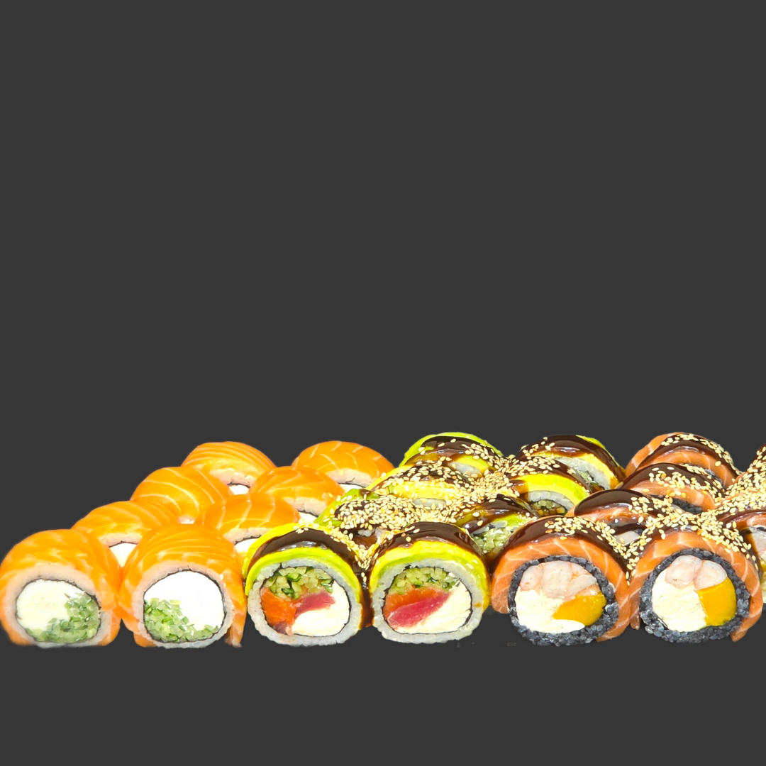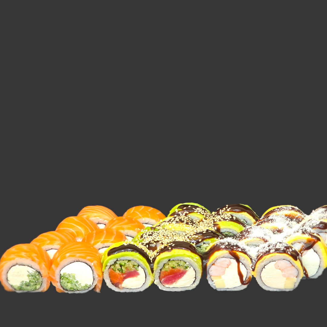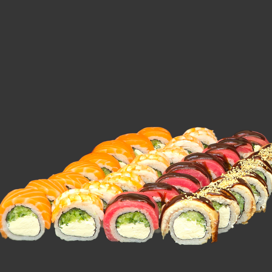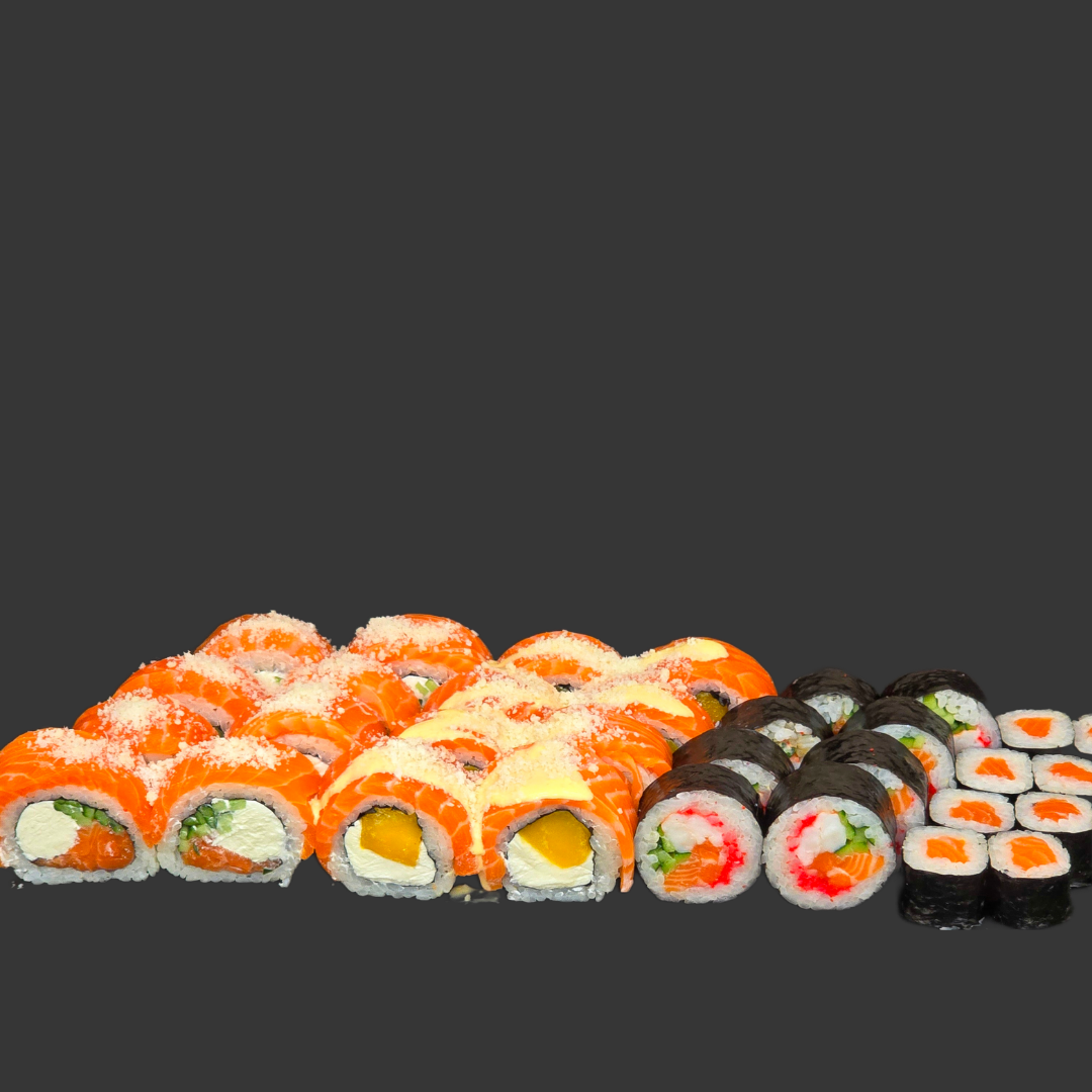 Лосось,Королівська креветка(всередині), рис, норі, огірок, крем-сир,соус манго, пармезан- це вишуканий LUX