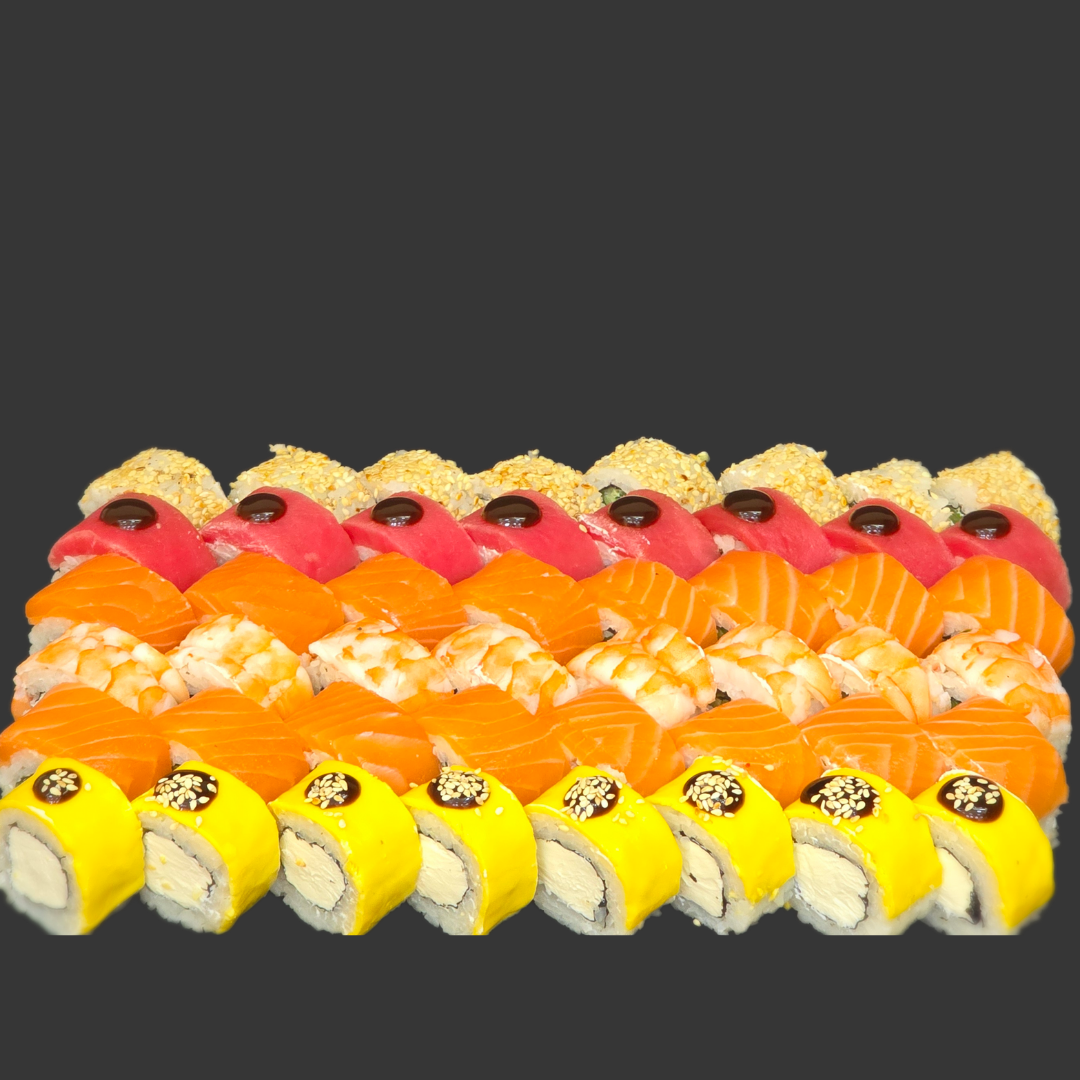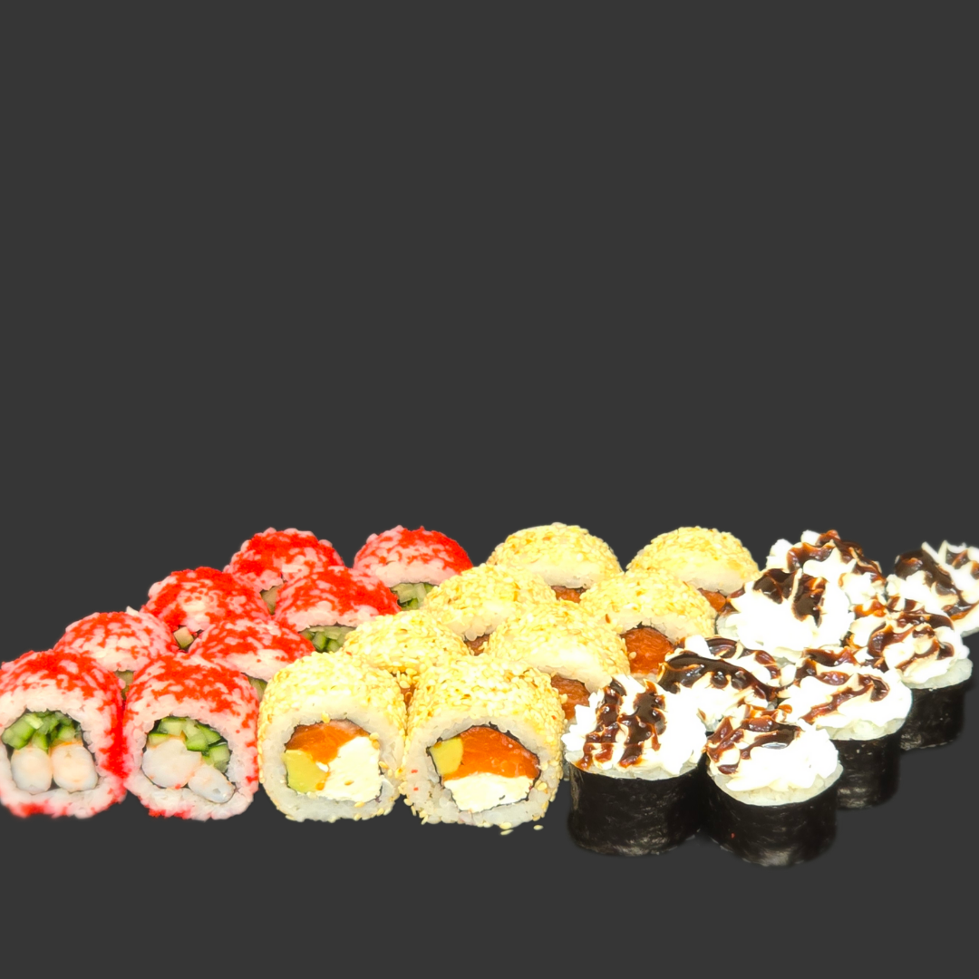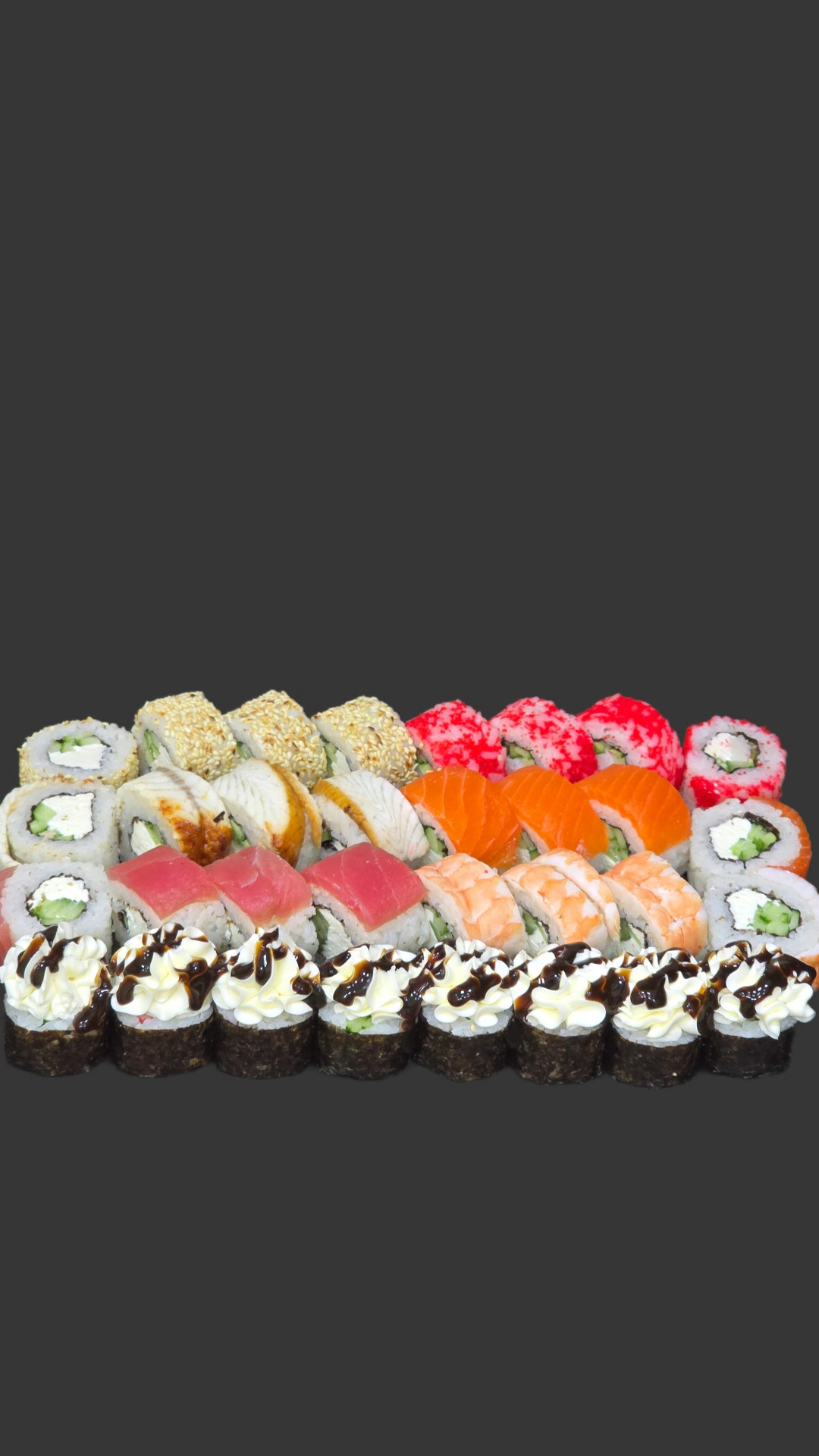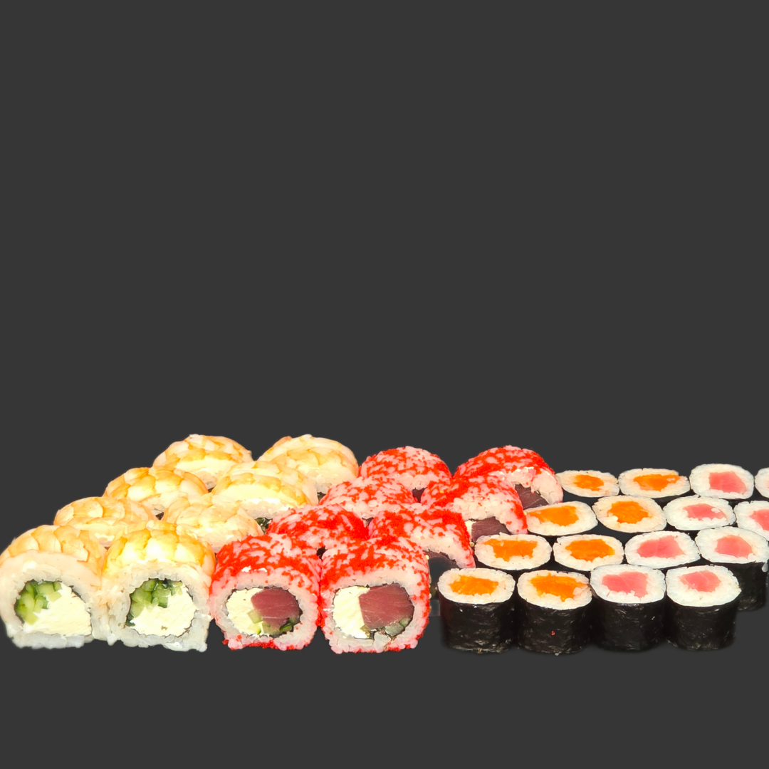 Лосось,Королівська креветка(всередині), рис, норі, огірок, крем-сир,соус манго, пармезан- це вишуканий LUX