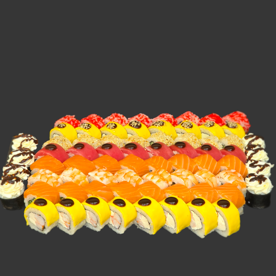 Лосось,манго(всередині),рис,норі,крем-сир,соус манго,пармезан-це вишуканий LUX