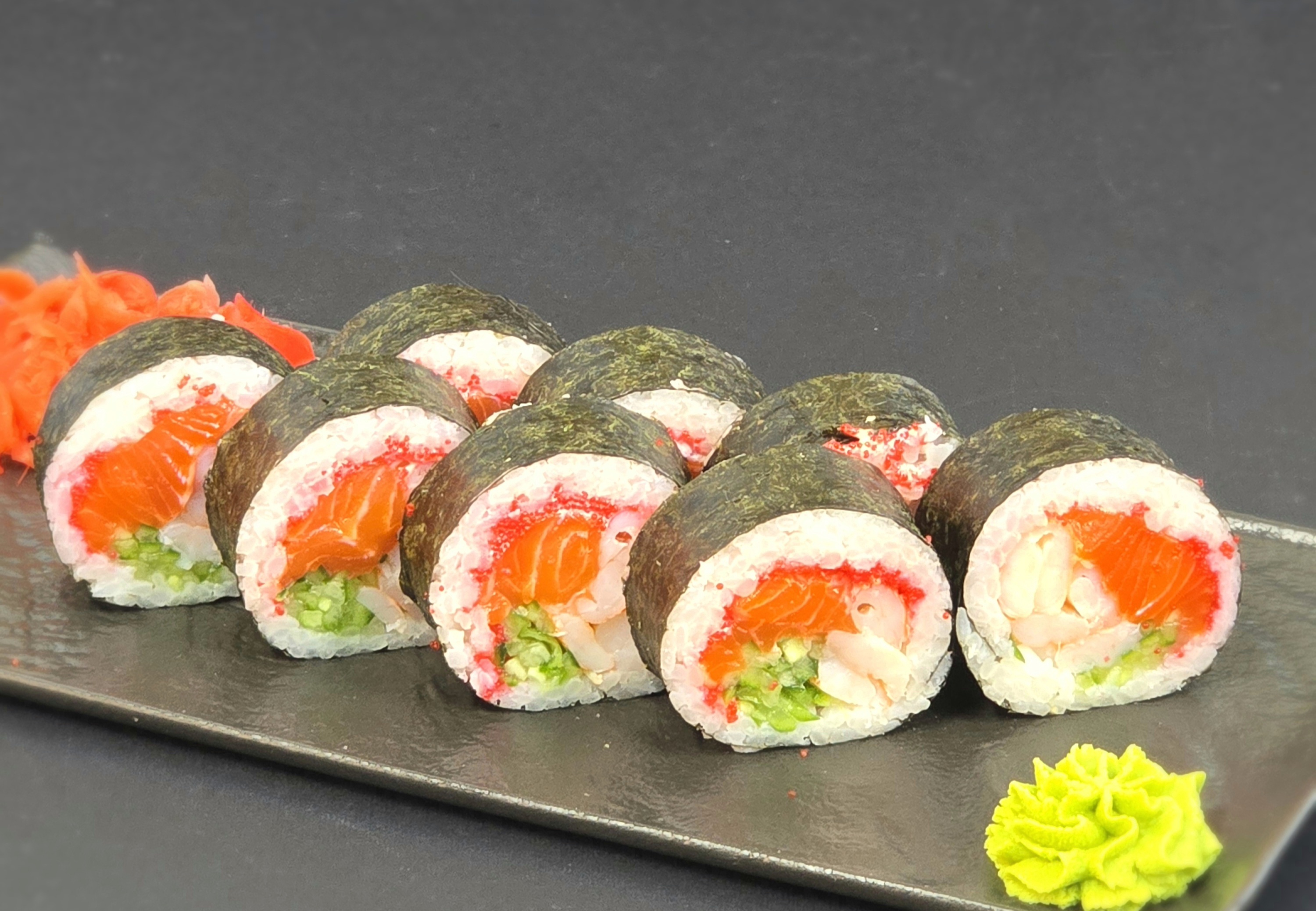 Норі,лосось,креветка, рис,спайс соус,ікра тобіко, огірок